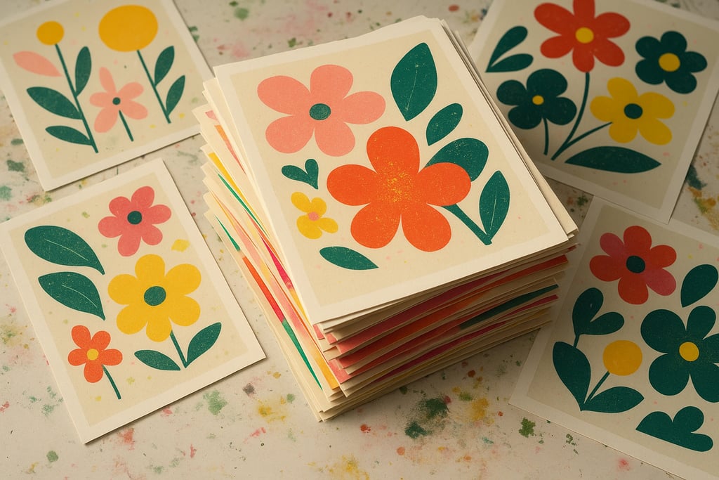 Mit unterschiedlichen Malmaterialien wirst du in einem ersten Schritt Vorlagen zeichnerisch angefertigen. Hier ist keine Scheu gefragt – es kann abstrakt oder gegenständlich gearbeitet werden. Anschließend werden die Schablonen in drei Durchgängen mit drei verschiedenen Farben auf A5 Karten oder A4 Plakate gedruckt.