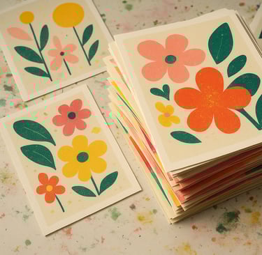 Mit unterschiedlichen Malmaterialien wirst du in einem ersten Schritt Vorlagen zeichnerisch angefertigen. Hier ist keine Scheu gefragt – es kann abstrakt oder gegenständlich gearbeitet werden. Anschließend werden die Schablonen in drei Durchgängen mit drei verschiedenen Farben auf A5 Karten oder A4 Plakate gedruckt.